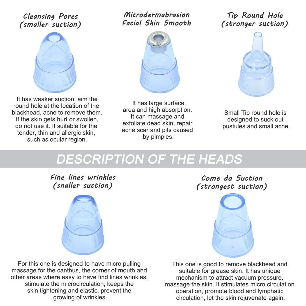 **2. Multi-Functional Design: Equipped with interchangeable suction heads and adjustable intensity levels, this device can be customized to suit your skin type and specific skincare needs. Choose from different heads for deep cleaning, gentle exfoliation, and precision extraction.